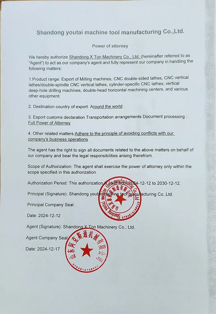 Proxy Authorization: Within the scope of authorization, Shandong X Ton Machinery Co., Ltd. will have the right to conduct all relevant operations related to export business in the name of Shandong Youtai Machine Tool Manufacturing Co., Ltd. This includes communication and coordination with customs, logistics companies, banks, and other institutions, as well as preparing and submitting necessary export documents and materials